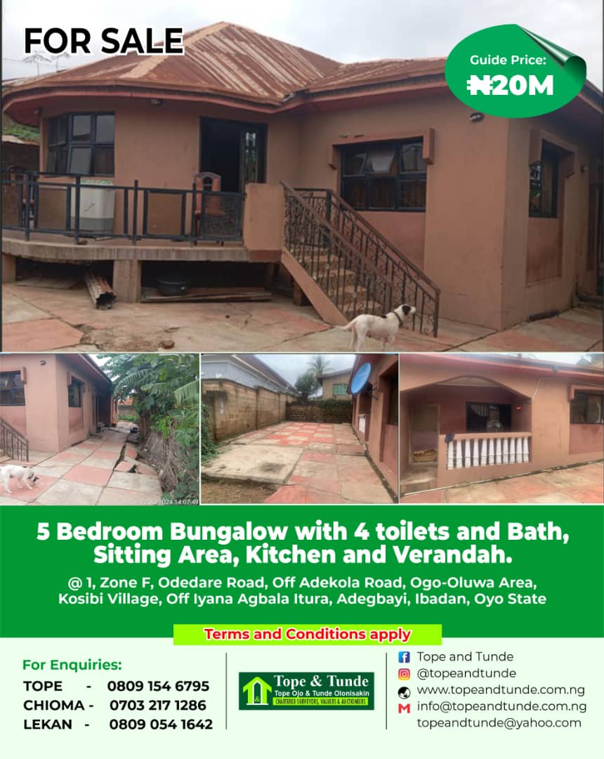 5 Bedroom Bungalow with 4 toilets and bath, sitting area, kitchen and verandah @ 1, Zone F, Odedare Road, Off Adekola Road, Ogo-Oluwa Area, Kosibi Village, Off Iyana Agbala Itura, Adegbayi, Ibadan, Oyo State